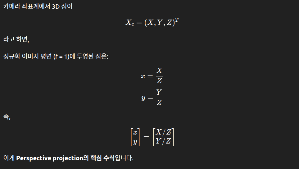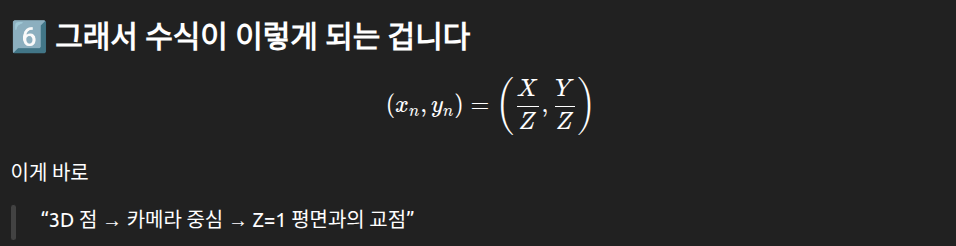 또한, 이는 우리가 최종적으로 만나게 되는 픽셀 좌표계에서 카메라 내부 파라미터 영향을 제거하고, 순수하게 기하적인 의미만을 가지는 좌표이기도 합니다.