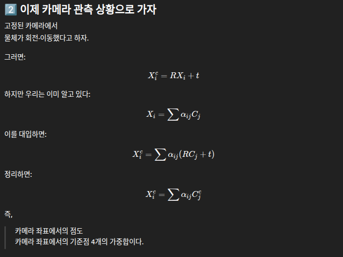 위와 같이 , 물체 좌표계에서와 같이 카메라 좌표계에서도 동일하게 한 점은 , 기준점 4개의 가중합임을 확인할 수 있습니다.