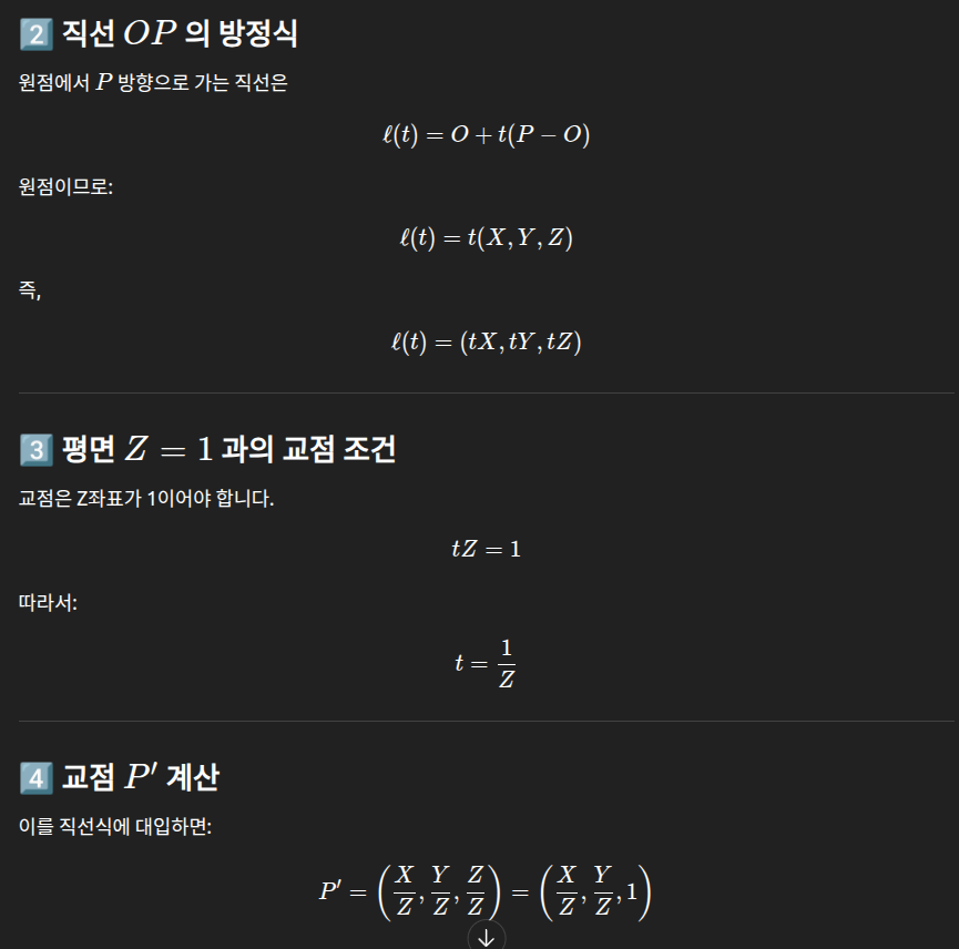 따라서 이러한 원리로 직선과 평면의 교점을 정규 이미지 좌표계 projection이라고 하는 것입니다.