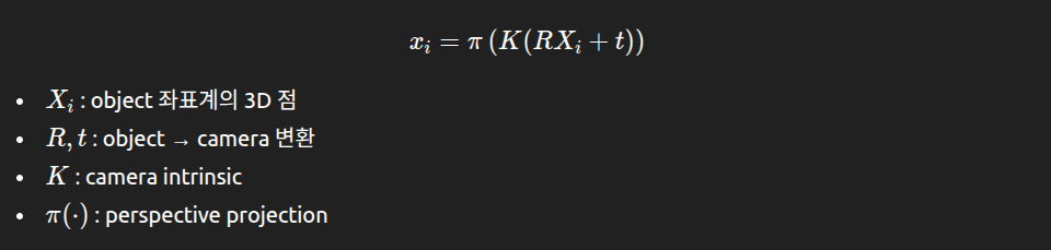 Xi는 object 좌표계에서의 3D 점, RXi+t는 카메라 좌표계에서의 3D점 입니다. pi를 통해 xi 즉 2D image 상의 한 점으로 mapping됨을 알 수 있습니다. 이 3개 변환 간의 관계를 잘 이해해야 해당 문제에 대해서 이해할 수 있습니다.